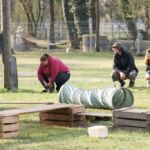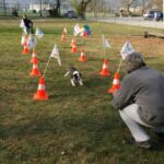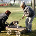 Dies kann ein Abrufen unter Ablenkung sein, (z.B. durch eine Fähnchengasse) oder den aufgestellten Parcours bewusst und konzentriert überqueren oder lernen, dass es auch auf einem fahrenden Wägeli schön sein kann. - Jetzt ist wieder Spielen angesagt. Die Welpen dürfen sich nochmals mit den anderen Artgenossen und den angebotenen Gegenständen befassen.